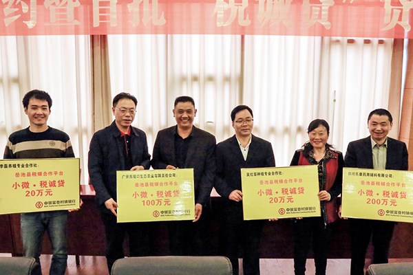 4月7日,四川省岳池县举行“税银合作签约暨首批“税诚贷”货款发放仪式,正式启动全省县级首个“银税互动”项目,破解中小微企业融资难、银行寻找优质贷款难的双向难题。在 “税诚贷”货款发放启动仪式上,岳池中银富登村镇银行现场为广安高垭口生态农业有限责任公司、岳池华茂陶瓷厂、吴红蓉种植专业合作社、李磊养殖专业合作社4户首批享受“税诚贷”业务的小微企业,发放320万元无需抵押的信用贷款,与四川乐康药用辅料有限公司签定“税诚贷”意向贷款协议200万元。