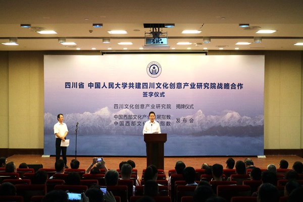 2016年7月28日下午,四川省与中国人民大学联合创办的四川文化创意产业研究院(以下简称“研究院”)正式挂牌成立,并向社会公开发布中国西部文化产业发展指数和中国西部文化消费指数。四川省政府副省长杨兴平,中国人民大学党委书记靳诺、常务副书记张建明,省文化厅党组书记、厅长、省文物局局长郑晓幸等领导出席仪式并致辞。