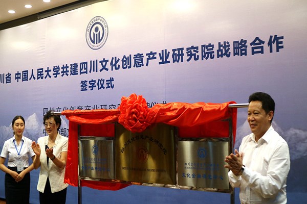 在揭牌仪式上,四川省副省长杨兴平、中国人民大学常务副书记张建明分别代表双方签署了共建四川文化创意产业研究院合作协议;中国人民大学党委书记靳诺和杨兴平副省长同时为四川文化创意产业研究院、四川文化创意产业研究院音乐产业研究中心、四川文化创意产业研究院文化金融研究中心揭牌,并为研究院专家委员会成员代表授予聘书。