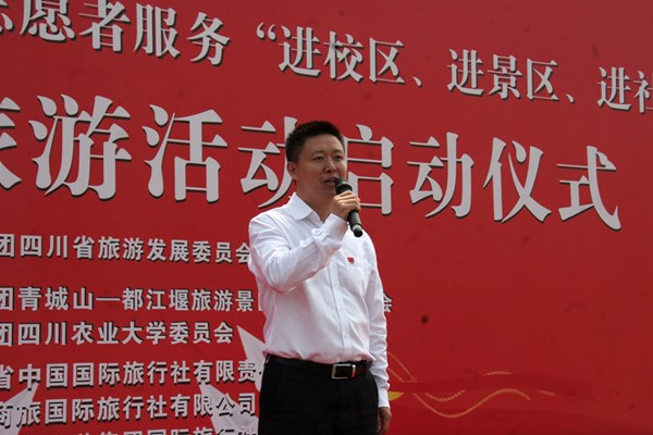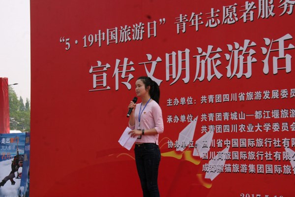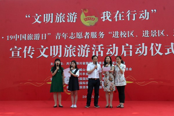 为深入开展“一学一做”教育实践活动,按照省旅游发展委、团省委和省直团工委工作部署,2017年5月19日,共青团四川省旅游发展委员会机关委员会联合共青团青城山_都江堰旅游景区管理局委员会、共青团四川农业大学委员会,以“文明旅游 我在行动” 为主题,组织广大青年干部和学生,开展青年志愿者服务“进校区、进景区、进社区”宣传文明旅游活动。团省委副书记张荣、省旅游发展委机关党委书记游勇、省旅游发展委机关党委专职副书记鞠敬、都江堰团市委副书记单单、青城山_都江堰旅游景区管理局机关党委书记张婧欣、 四川农业大学旅游学院行政办主任魏俊益出席活动启动仪式。