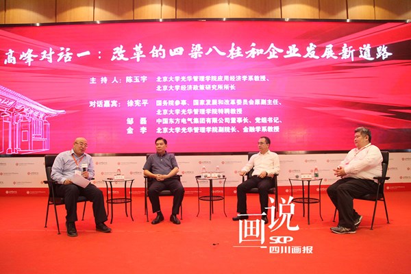 在学术研讨和高峰对话环节,第一场高峰对话由北京大学光华管理学院特聘教授、国务院参事、国家发展和改革委员会原副主任徐宪平教授, 中国东方电器集团有限公司董事长、党组书记邹磊先生,北京大学光华管理学院副院长、金融学系金李教授共同探讨《改革的四梁八柱和企业发展新道路》。