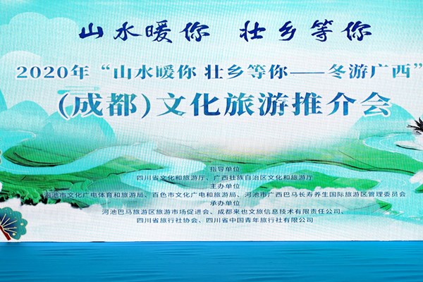 11月18日下午,由广西省河池市文化广电体育和旅游局、百色市文化广电和旅游局、河池市广西巴马长寿养生国际旅游区管理委员会主办的2020“山水暖你 壮乡等你—冬游广西”(成都)文化旅游推介会在蓉成功举办。