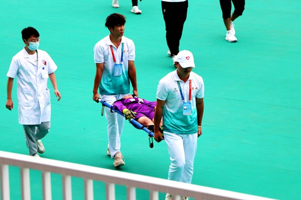 8月2日11点30分,女子足球比赛中绵阳队守门员李漫妮被球砸中脑袋,现场的医护人员迅速反应,当场为运动员检查伤势。在经过一系列检查后,发现李漫妮出现轻微脑震荡相关症状,医护人员紧急将其送往医院,并陪同检查直至返回宿舍,目前李漫妮已完全恢复。