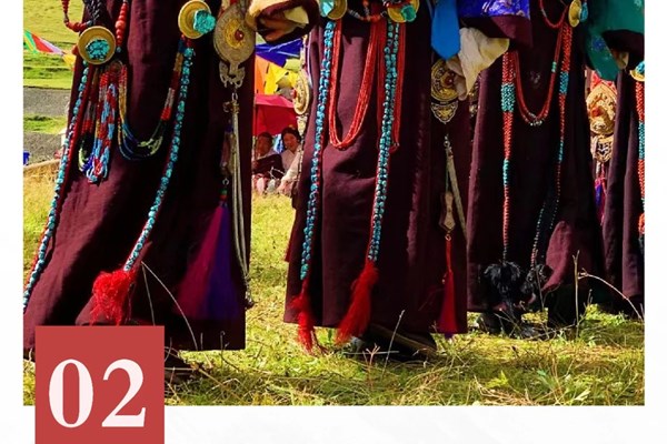 白玉传统服饰风格独特,制作精美。据说,白玉男子的传统服饰中头饰源自尼泊尔、汗衫样式来自印度、氆氇山源自本地、裤子样式来自蒙古、靴子样式来自宫廷的官靴。经过长久的融合创新,才形成了如今特色鲜明的白玉传统服饰。如今的白玉传统男装为右襟齐脐短装,外罩圆领宽袖长袍,缀以氆氇、豹皮等装饰,下身着灯笼裤,脚踩官靴。头戴意为“六字真言”的“阿德头饰”,身背护身嘎乌,腰间佩戴的降魔宝剑彰显着男子英勇之气。女子传统服饰则仿照了格萨尔王的王妃“珠姆”的隆重装饰。头上饰以如珊瑚、玛瑙、松耳石、蜜蜡、金银制头花等精美的宝石,把最荣耀和宝贵的放在头顶,从头部一直延伸到前胸或后背。白玉县的女子头饰没有婚否标记,无论老少,都将头发编成许许多多细长的辫子。前额分发处从额头顶到后脑勺顺着发路编一根较粗的发辫,额顶嵌上蜜蜡,用两颗珊瑚串上一颗绿松石固定在头顶,后脑勺用头花点缀,代表着吉祥如意、平安快乐。 (白玉县文化广播电视和旅游局供图 )