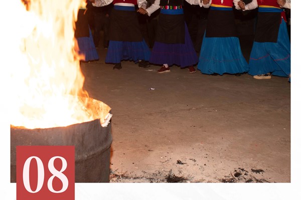 每年正月初六,“庇牟”(汉语称其为东巴或者和尚)会指派年轻的后生上山采集7种不同的野花枝。然后再打上掌盘,背上背篓到村子里挨家挨户收集族人自愿捐出的钱物供品,购买鞭炮和祭祀用品。初七送年节当天一大早,“庇牟”便带领全族人将预先酿造的“砸杆酒”、肉和祭品一同送上村后林中挂着羊头和红绸带的神树下,再支上大锅煮“百家肉”。然后众人用前一天采好的七色花枝搭祭祀神坛。祭祀开始,“庇牟”烧香拜祖后,开始唱祭祀歌,如其中一段大意为:“我们住在高山,离天最近,离祖先灵魂最近,远离战乱,相亲相爱;我们住在密林,找吃食最近,离亲人最近,远离纠纷,互帮互助……”祭祀结束后,在铺有松毛的地上摆上“百家肉”,斟上“砸杆酒”,族人们开怀畅饮。老者聚在一起商谈族中大事和传承事宜,妇女们则拿出自家刺绣、鞋垫、香包相互鉴赏,相赠祝福,青年们则用火枪、弓箭打靶欢乐。夜晚,众人围着篝火尽情地跳舞,共享欢乐,直至天明。