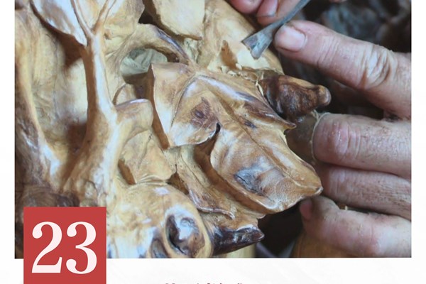 苍溪根雕选材讲究自然天成,需要材质坚硬、木质细腻、木性稳定、不易龟裂变形、不蛀不朽易于保存的树种,大多为黄杨、檀木、榉木、柏木、榆木等天然名木古树的桩头。当然,对于工匠来说,被水中淤泥淹没或深埋土中,历经数百年碳化形成的古老阴沉根木也是一件难得的雕刻珍材。工匠需要“因材施艺”,针对不同木材,发挥奇思妙想,在雕刻的同时,尽可能彰显木材天然机理,达到雕而不雕、不雕而雕、浑然天成的效果。一件完美的根雕作品完成,少则几天,多则数年,每一件都极尽工匠心血,且不可复制。