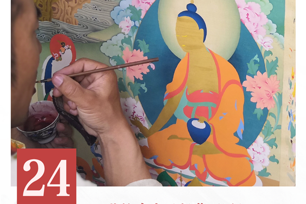 门萨画派与其他画派最大的不同在于“起稿”这一环节。门萨画派的画师不打格不画线,仅凭画师的记忆与功底,直接在布面上勾画佛像。待勾画完成后再用《度量经》的规制衡量所画是否准确。且该画派在绘制时十分讲究“协调”与“韵律”。协调是指画面布局、色彩关系、人物动态、山水石树等背景都融入了画师本人对世界的认知与感悟。韵律则是指画面线条是否流畅传神,“见色不见笔”,所绘人物讲究相互呼应,身体曲线流转自然、起伏得当,主尊与周边所绘以神情顾盼、若有所思为佳。门萨画派的唐卡画法各有创新,但在佛像眼部的画法上却保留了传统的古拙式样:静寂像眼形如鱼,眼角细长,略带笑意,令人一见便生亲近之感;忿怒相则三目圆睁外突,眼露四白,庄严威猛;仙女飞天眼部细长,眼尾上翘,极尽婀娜之态。整幅唐卡落笔大胆、一气呵成;用色鲜明、古朴厚重,是不可多得的文化瑰宝。