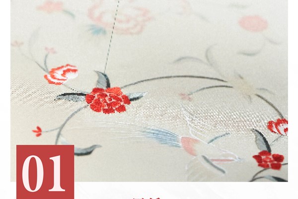 蜀绣针法严谨,线条细腻,色彩明丽,题材丰富,其工艺风格特点是以针代笔,以线代墨,通过不同的针法和丰富的丝线色彩来表达画意。所用材料和工具包括针、线、面料、配线、劈丝(线)、刺绣、装屏(框)等,有铺针、盖针、滚针等130多种针法。