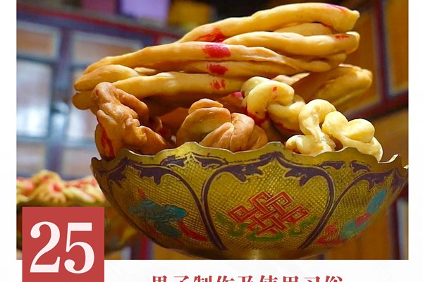 果子制作有以下五步。第一步,将水、猪油、糖、鸡蛋按比例放入面粉里,充分搅拌均匀;第二步,将面团放在温度适宜的地方,用大碗或盆盖住面团隔绝空气;第三步,用擀面杖将醒好面团擀成厚度均匀的面皮,面皮上均匀地涂上食用色素;第四步,用刀将面皮切成大小一致的长条,就可以开始翻花了;第五步炸果子,炸果子是考验果子制作技艺的一个重要环节,炸主要是看火候,油温要保持在70-80度之间,这样才能保证炸出来的果子颜色艳丽、酥脆可口。