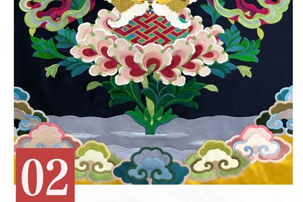 藏族唐卡(贴花唐卡)由刺绣发展而来,使用真丝锦缎为原料。其工艺以堆贴为主、刺绣为辅,首先将各色棉布、绸、缎剪成设计好的各种图案形状,再精心堆贴成完整的画面,最后用彩线绣制而成。藏族唐卡(贴花唐卡)融合发展了堆、绣、裁剪、熨烫、擀毡、植物染色等工艺,最终呈现出颜色绚丽、层次分明、立体感强的艺术效果,在人物造像上更加追求造像的神韵。藏族唐卡(贴花唐卡)的保存时间较更长,可制作晒佛仪式所用的大型唐卡,此外还可用于服装装饰上。