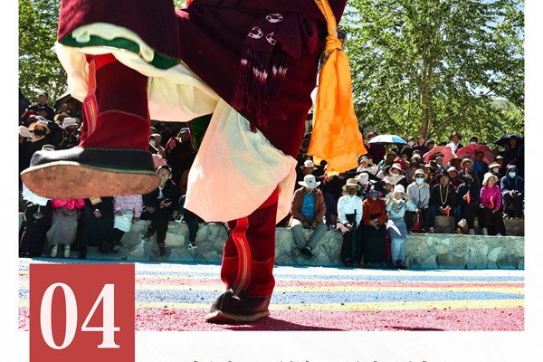 “邓玛宫廷舞”主要分布于甘孜州石渠县,为藏族圆圈舞蹈,亦歌亦舞,歌舞结合。该舞以前多是在藏族的重要节日庆典时表演,现在也会在室外进行演出,其主要目的是向神灵祈愿,希望众生平安心想事成。其流传至今,仍有严格的礼仪性环节,即有“颂”“卓跌”“邓玛娜卓”“扎西”4部分仪式流程。跳舞时,男生头戴红须帽,藏袍的刺绣多在领边,腰间系颜色鲜艳的精美腰带,佩戴嘎乌盒和佩刀;女生则需装扮由绿松石或琥珀镶嵌的头饰,刺绣多在裙摆处,佩以腰带和银饰。舞蹈以锅庄的表演形式进行,即男女围成一圈,男生舞步如大鹏展翅,张开双手,左右脚交替腾空而跳;女生的舞步则较为端庄含蓄,动作幅度较小,唱跳结合。舞蹈的队形及演唱的节奏由两位格根(老师)监督指导,队伍的行进由男卓本(领舞)带领,演唱形式是男女对唱,根据不同的活动主题而演唱不同的歌词。