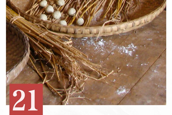粬药制作是根据不同酒类型选择原料的,主要原料有大米、米糠、麦麸皮,辅料为中、草药。制作的工艺流程有选择鲜辣蓼草、去茎、复晒取叶、粉碎、过滤等60余道工序。在多个制作过程中,配料比例要恰当。例如,拌水要根据季节不同而定,并充分搅拌均匀。蒸料时间要控制恰当,不能过长或过短。蒸料后加拌辅料(接种)中也要搅匀,消除疙瘩。粬料放凉至32℃~34℃左右,即可装池。装池时厚度均匀,松紧一致,前、中、后三段的温度要得当,通风时要注重料温的变化,一次通风和间歇通风的温度要控制得当。
