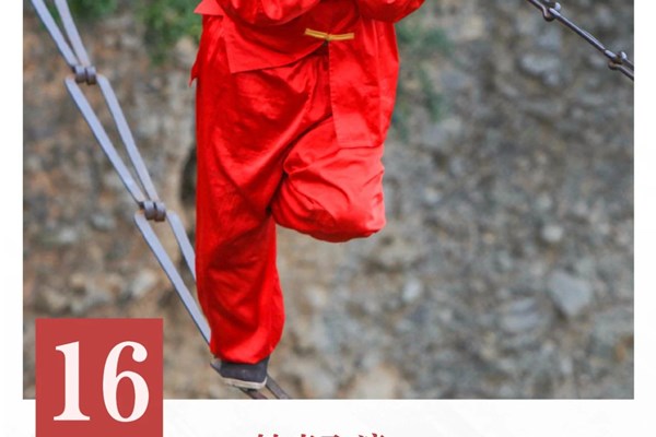 铁索飞渡表演难度巨大,在飞渡过程中需表演双手脱链、金鸡独立、鹞子翻身、空翻跟头、空中八卦、倒挂金钩、海底捞月、韦驮献佛、素秦背剑、仙人指路、单臂大回环、敲钟、祭拜、飞檐走壁等数十个高、惊、险动作,其表演一气呵成,险象环生。铁索飞渡表演分五个步骤,整个表演持续20分钟:第一步,热身放松,疏经运气;第二步,穿上专业服,佩戴安全带;第三步,飞渡铁索、表演绝技;第四步,敲钟、祭拜;第五步,飞檐走壁,返回。铁索飞渡表演最大的难点主要表现在两个方面:一是“控制平衡”,一旦触动铁索桥,它将无规律的一直晃动,需要表演者练就与铁索共舞的本领;二需要扎实的“武术功底”,在铁索桥上行走本是一件本领,可是要在上面做出各种高难度表演动作,就需要长期对这些表演动作进行练习,直至达到炉火纯青的地步。