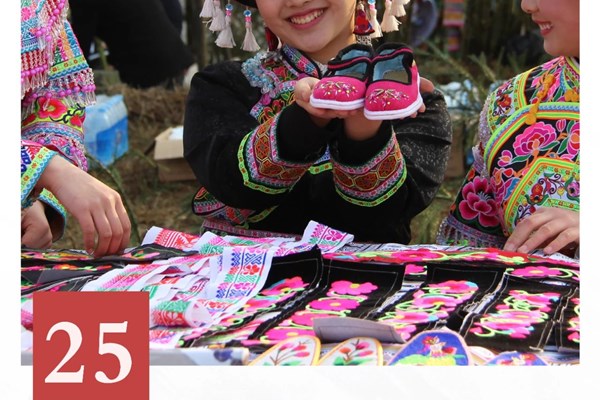 苗族刺绣工艺讲究,色彩夸张,对比强烈而统一协调,构图自然和谐,形象生动流畅,洋溢出一种独特的艺术风格。制作前,选用苗家特有的花布料或绸缎为底,再选用各色棉、麻、丝线、绣花针以及两个直径约30厘米的篾圈作为材料和工具。制作时,通过绣、插、捆、洒、点、挑、串这7种不同的针法达到平绣与凸绣的立体效果。