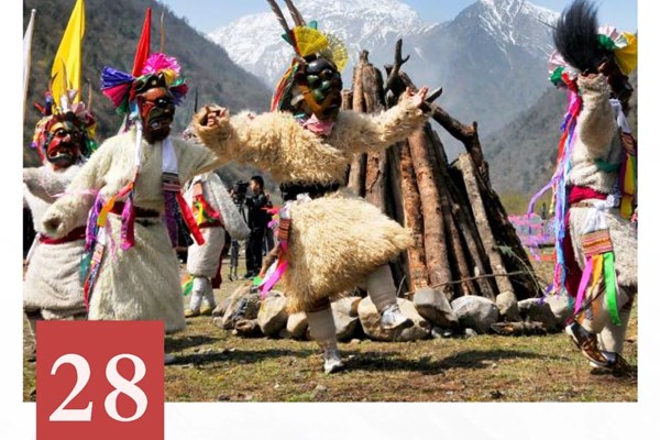 曹盖是白马藏语音,意为“面具”。曹盖面具是似人似兽的“达纳尸界”(黑熊神)神灵形象。跳曹盖大多在正月初五至初九举行,整个活动一般历时两天,祈祷来年风调雨顺、无病无灾。活动包括:宰羊念经、引出曹盖、镇邪、劈魔、祭祀山神等在内的多项内容。各项活动间有短时间间隔,显得相对独立。跳曹盖前,全寨集体出一只羊,各户要分别出酒、烧馍和柴火,聚在一起共同分享。“白马藏人跳曹盖”动作简单而程式复杂。其身体语言、器乐节奏、情节程式都具有鲜明的民族特色与艺术价值。