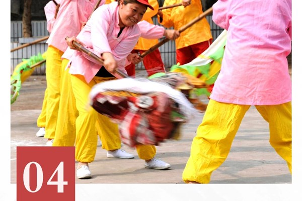 舞龙套式主要有:五龙归位和蛟龙翻滚。五龙归位是龙头从中心点开始,分别向东、西、南、北昂头、点头,龙身随之摆动,完成东西南北方位后,复归到开始时的中心点位置。蛟龙翻滚是长龙分顺时针和逆时针形成圆圈来回滚动。随着川剧锣鼓的鼓点,时缓时急、不断变换各种队形。恢复归位后,龙队成一字形。