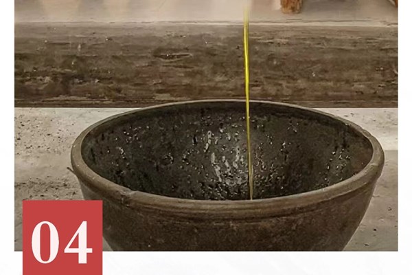 土法榨油技艺中的关键点是炒籽控温。炒籽时,需要预热铁锅,再放入菜籽煎炒,先用温度不超过80度的微火,而后逐渐加温到不超过110度,整个过程使菜籽均匀受热,透出香气。稻草包饼则是土法榨油技艺中的难点之一,为了控制好籽料温度和出油质量,稻草包饼需要又快又紧,确保油饼在压榨过程中能够充分出油。值得注意的是,土法榨油技艺从工具、原料到产品都天然环保健康。榨油机几乎全由木料构成,其他器具不是石料就是竹器、稻草,铁器也用得不多。原料更是选用从不使用化肥、农药的兴文县独特的野生菜籽油。纯物理压榨的方式,将油脂分离出来,保证菜油天然营养不受破坏。菜油色泽油亮,香味浓郁醇厚,口感润滑绵长。