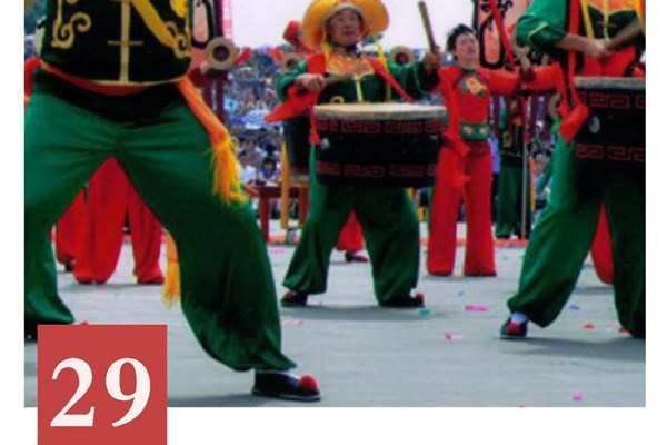 蓬莱大乐相传起源于周朝宫廷。唐代开元年间因唐明皇喜爱其“高昂悦耳、队形壮观、气势磅礴”,被钦定为“大乐”,专供皇帝登基和出巡使用。明末战乱,一位青年宫廷乐师流落四川中江,将技艺传于民间,世代相袭;清光绪年间传入大英县蓬莱镇,逐渐发展成今天的蓬莱大乐。
