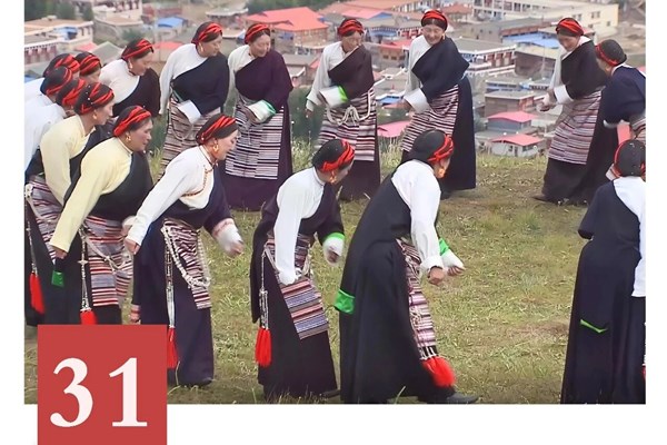 锅庄舞又称“果卓”“歌庄”等,藏语意为“圆圈歌舞”,是藏族三大民间舞蹈之一,主要流行于道孚县尼措片区和瓦日片区。舞蹈时,人们拉手成圈、分班唱和,由男性带头起唱,女性紧随其后,歌声嘹亮且穿透力强。除吉庆礼仪场景外,每逢秋高气爽之时,当地人也会身着盛装、佩戴首饰,聚集一处翩翩起舞、欢庆娱乐,这种形式被称为“耍坝子”。此类舞蹈无需乐器伴奏,由领舞者起歌引舞,男女轮歌行舞,是典型的传统歌舞形式。