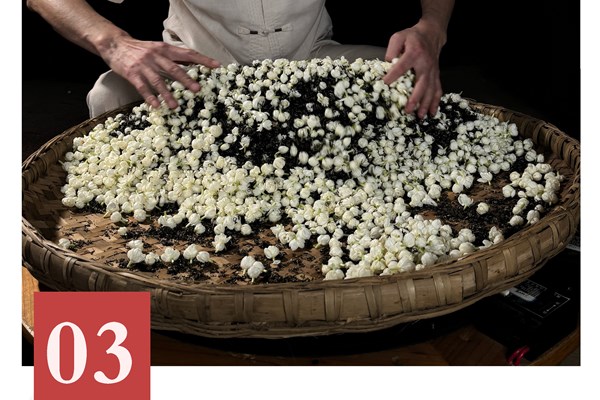 犍为茉莉花茶制作技艺的核心在于择花、炒花工艺。制作流程繁复精细,主要包括茶坯处理与茉莉花加工两大部分:先将本地中小叶种茶树鲜叶经杀青、揉捻、干燥制成茶坯;再将当日采摘的金犍茉莉鲜花手工去除青蒂、择成单瓣,与茶坯层层叠加进行窨制。静置一定时间后,连花带茶一同入锅以文火炒制,使花香与茶味在高温湿热中深度交融,形成独特的熟香韵味。这一工艺不仅保留了茉莉花的鲜灵芬芳,更赋予茶汤澄黄透亮、花瓣洁白如雪、滋味鲜醇甘爽的感官特征。