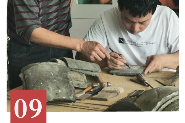 制作开江瓦雕要经过一套完整的传统工序。首先是原料处理,选取当地烧制的青瓦,经筛选、清洗、晾晒后,用粗石板打磨瓦面至平整光滑;接着进行图案设计,用铅笔在瓦面勾勒图案的轮廓;接下来是雕刻,这也是制作开江瓦雕的核心环节,该环节融合了阴刻、浮雕、透雕等技法——阴刻以刀痕勾勒线条,浮雕通过分层凿刻使形象凸起,透雕则镂空多余部分营造虚实感;最后根据需求进行上色或保留瓦面本色。开江瓦雕的题材大多是川东民俗、民间传说、神话故事、历史典故、自然意象等。