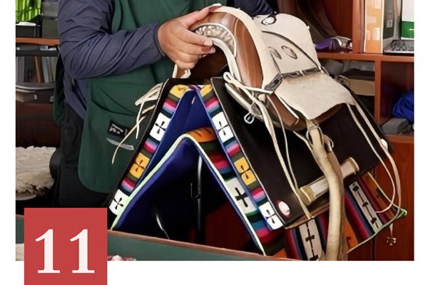 组装分四部分,左右鞍板对称、前窄后宽,用泡软牛皮绳穿小孔拴紧成整体。成品马鞍色泽红润,不易开裂,凹痕可自行恢复。