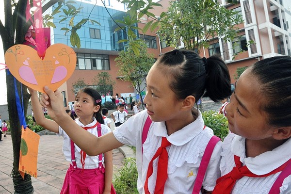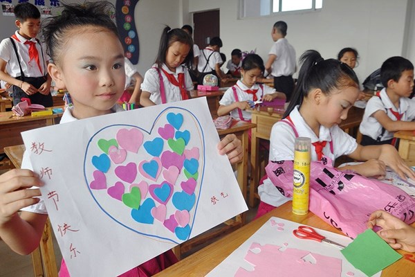 “今年是第三十个教师节,我用许多小爱心帖在这个大爱心里面,以表达我对老师的无数感激,祝老师们身体健康,节日快乐。”9月10日,四川省泸州市纳溪区东升小学校园一片温馨,该校开展的“手工贺卡庆祝教师节”活动正传递着浓厚的师生情谊。